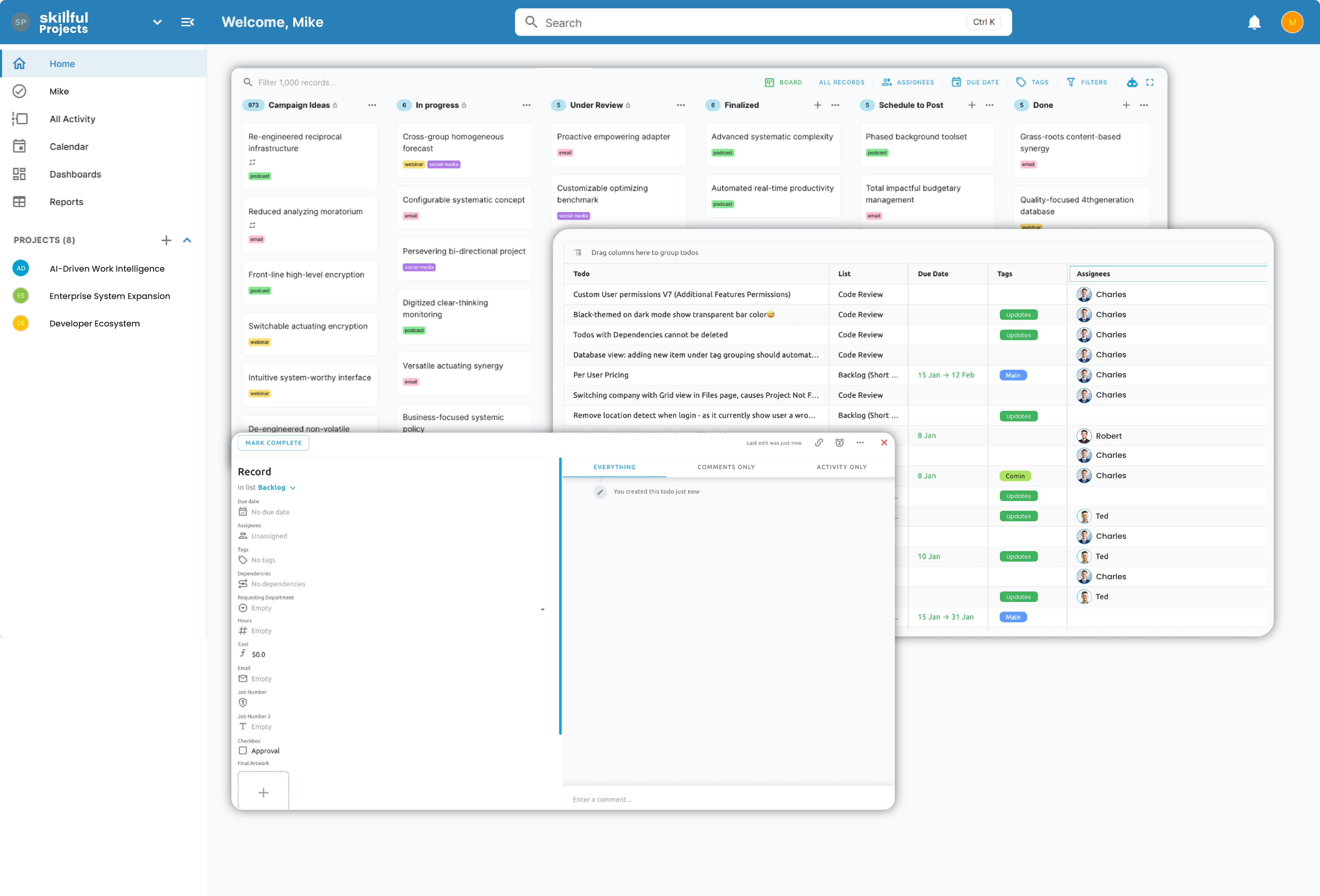 Skillful Projects is our all-in-one productivity platform that centralizes your tasks, documents, goals, and communication, so your team can move faster, work smarter, and stay aligned. With fully customizable workflows and real-time collaboration tools, Skillful Projects eliminates miscommunication, reduces bottlenecks, and keeps everyone focused on what matters most.Â